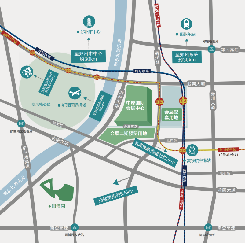 會展中心地處航空港中部核心地帶,距機場僅6公里、高鐵航空港站2公里,依托作為鄭州發展新引擎的航空港區所擁有的航空、高鐵、地鐵、高速“四維交通”網絡,真正實現了多種交通方式間的“零”換乘。這一卓越的交通便利性,是吸引全國參展商與專業觀眾高效匯聚、擴大展會規模及影響力的關鍵因素,不僅免除了換乘繁瑣、節省時間精力、顯著優化參展體驗,更將進一步提升展會的專業性和參與度。