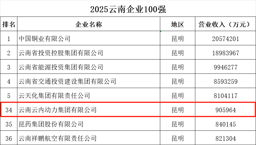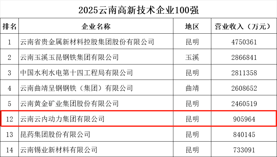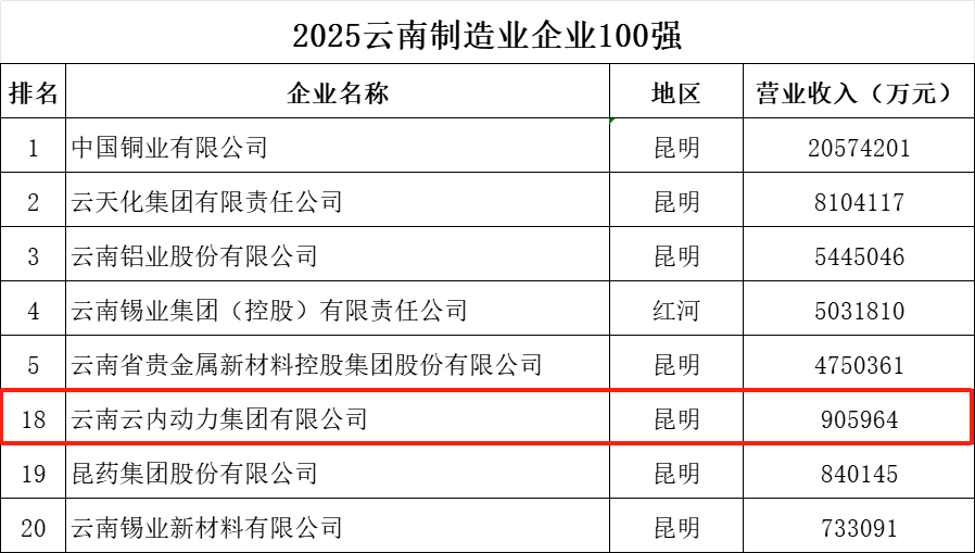 云內(nèi)動(dòng)力集團(tuán)榮登“云南企業(yè)100強(qiáng)”、“云南制造業(yè)企業(yè)50強(qiáng)”、“云南高新技術(shù)企業(yè)100強(qiáng)”榜單